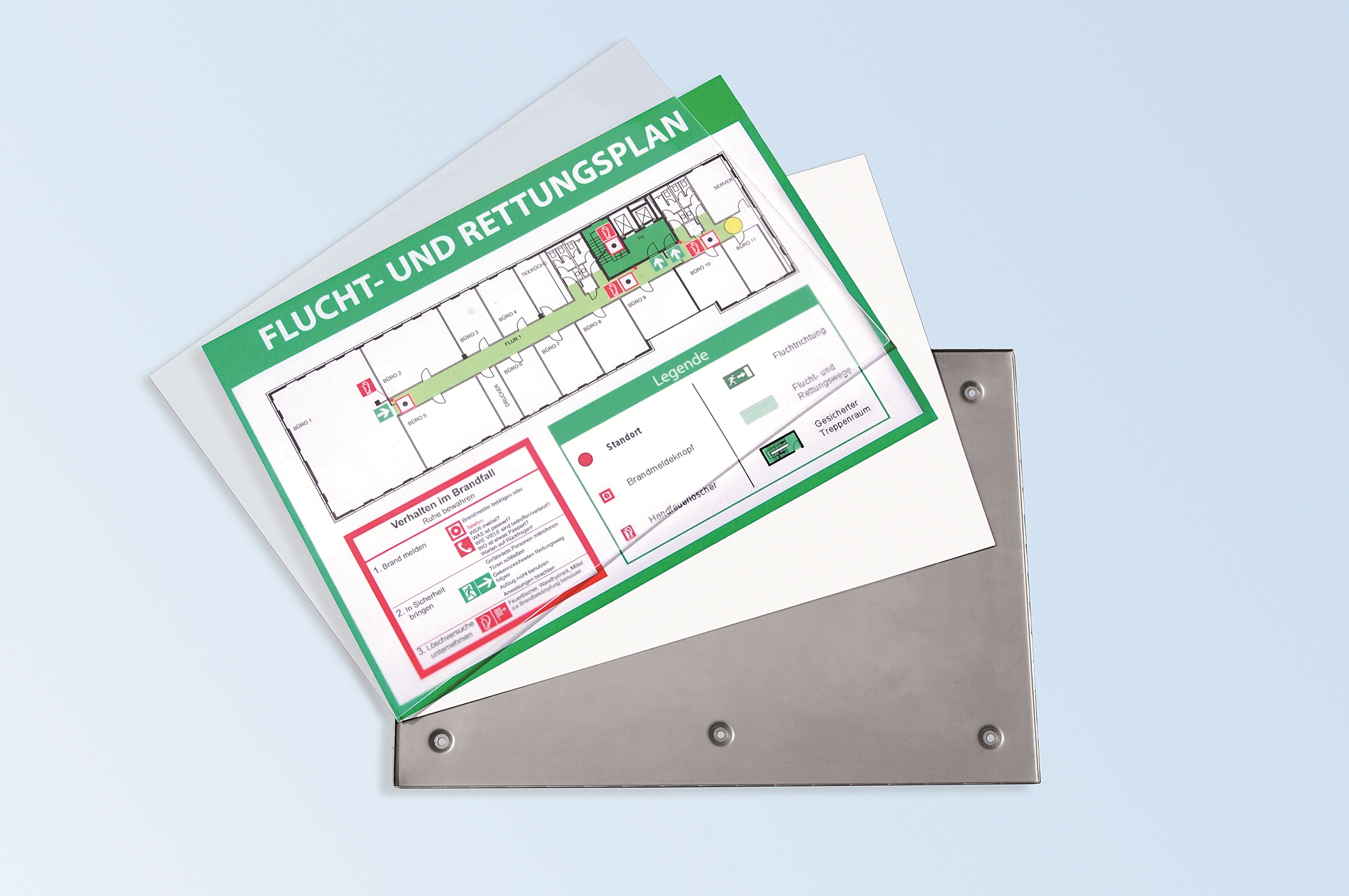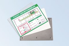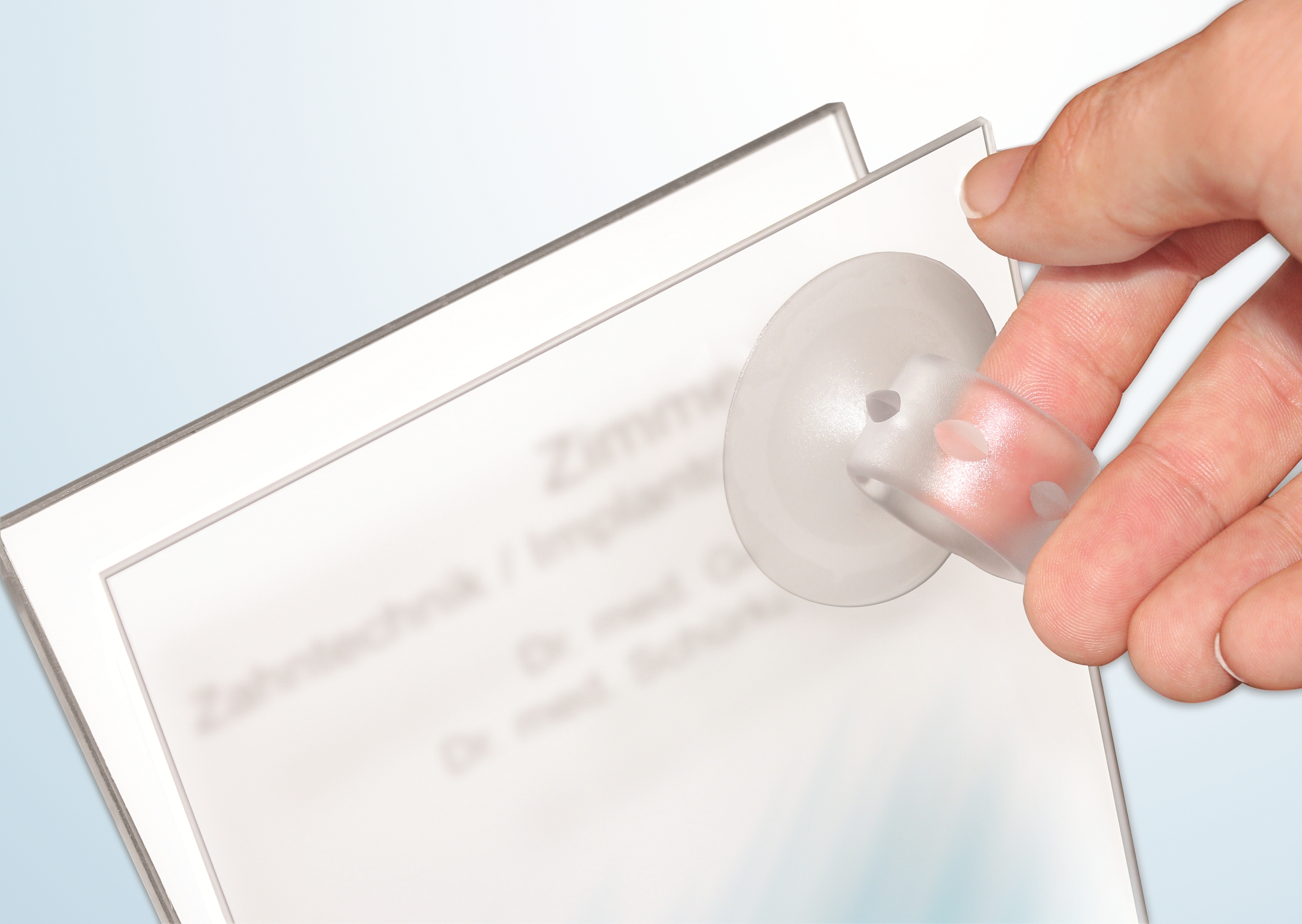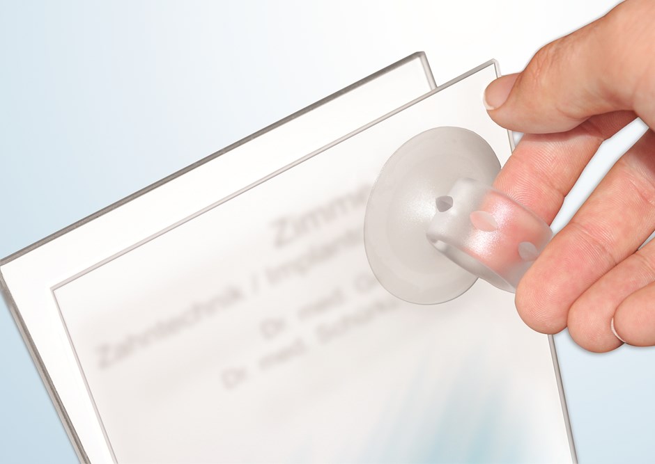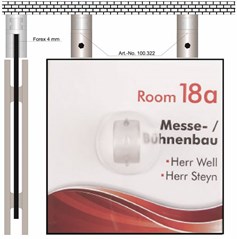 -reflet est rainuré sur la tranche et se clipse dans la cassette grâce aux points côniques réalisés dans le cadre inox. La fixation est avec vis de 4 mm et, en fonction de la taille de l'écran, 4, 6 ou 8 vis. En variante, les petits formats peuvent aussi être collés par adhésif double face sur des surfaces lisses grâce à la plaque intermédiaire de 3 mm en forex : article FINSSPL. En raison de l’emboutissage arrière de 5mm, la plaque semble flotter sur le mur. En raison de la très mince épaisseur du cadre (4,5 mm), l'impression de légèreté est renforcée. Le plexi peut être facilement enlevé à l'aide de la ventouse pour modifier le document imprimé par vos soins. Le système est complété par de variantes en fixation drapeau, fixation fixe au plafond ou suspendue de même qu’en chevalet porte