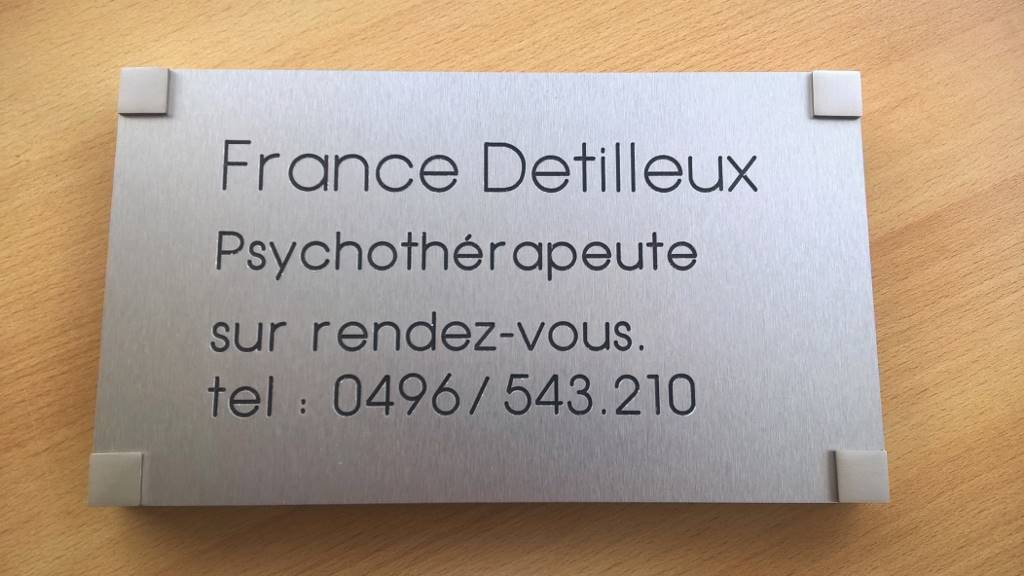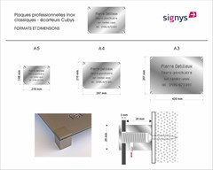 plaque professionnelle en alu brossé 3mm (composite); texte gravé apparaissant en noir; montage sur 4 écarteurs diam 13mm en inox brossé + vis et chevilles