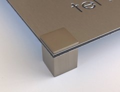 plaque pro alu brossé 3mm (composite) avec texte gravé + 4 écarteurs carrés diam. 13mm + vis et che
