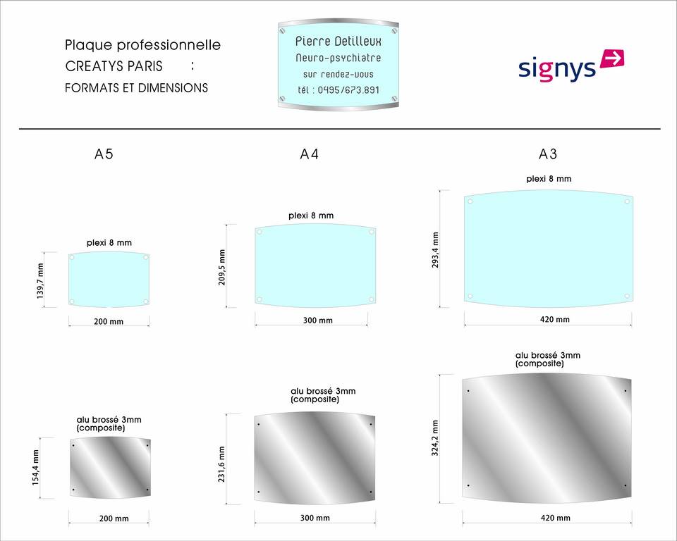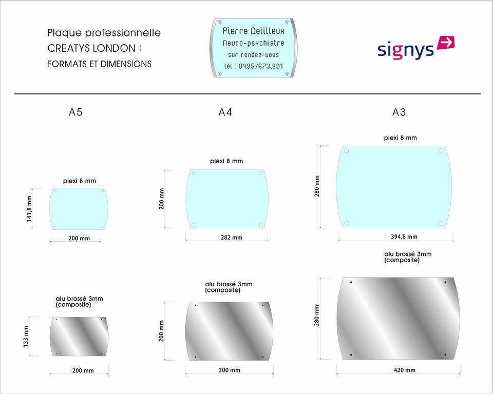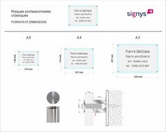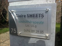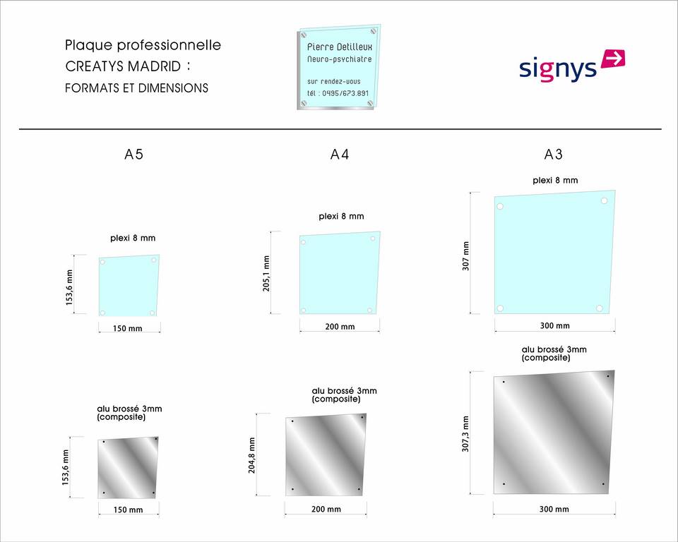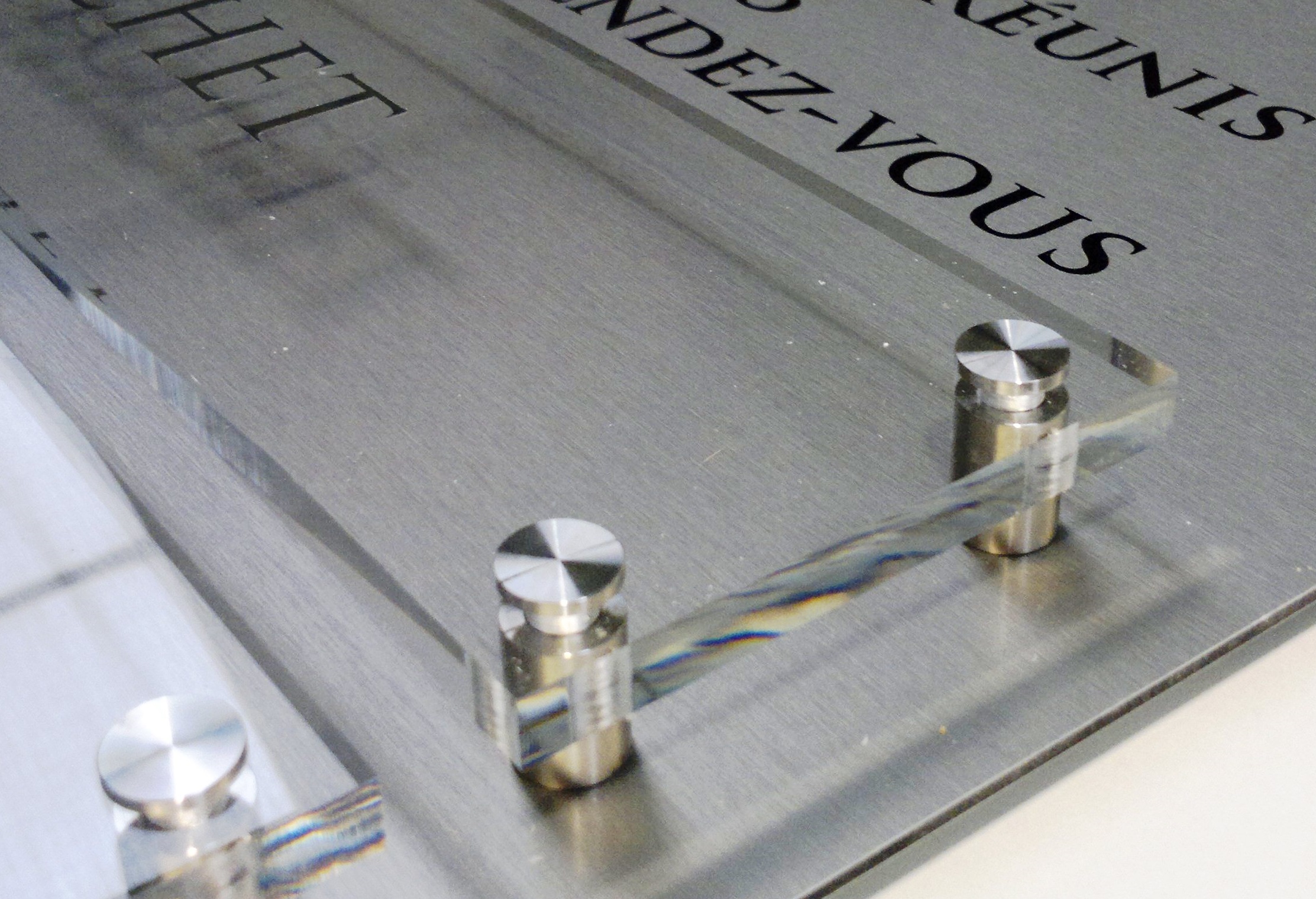 -plaque en alu brossé 3 mm + film sablé de contraste; montage sur 4 écarteurs carrés 20mm en inox brossé + vis et chevilles
