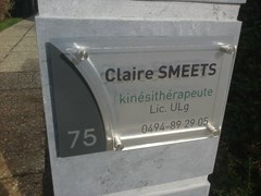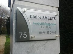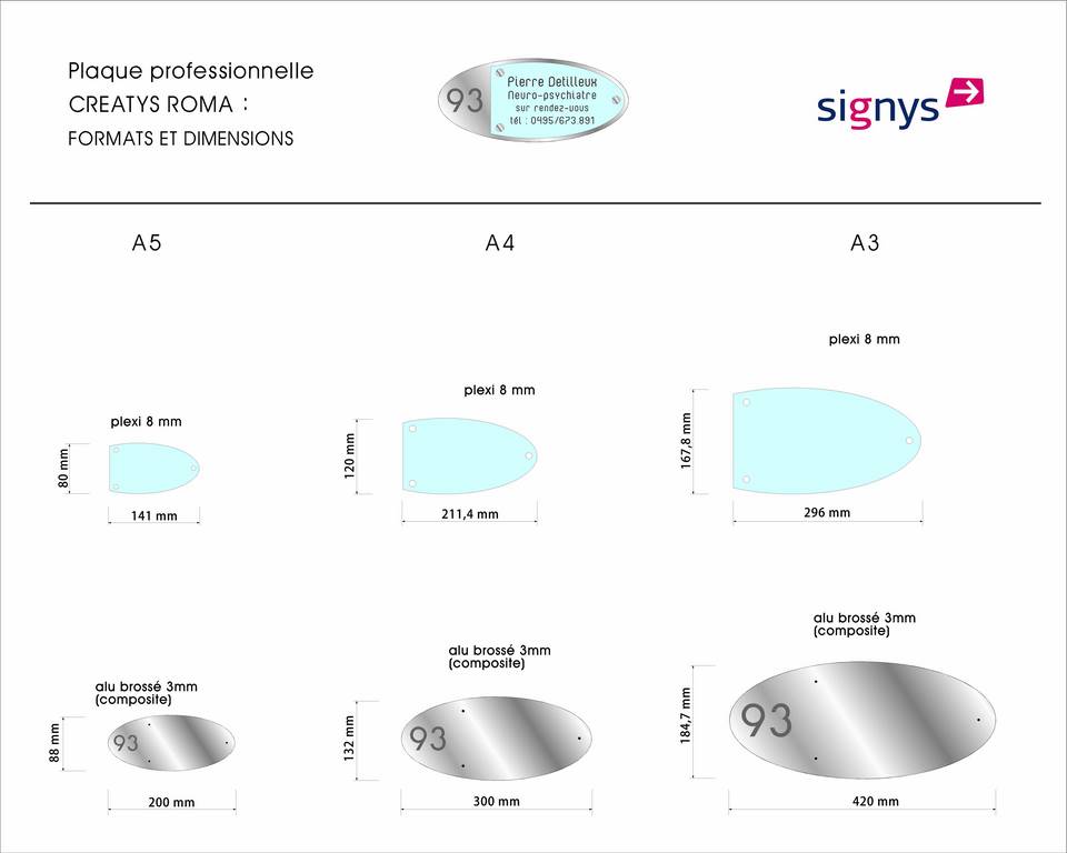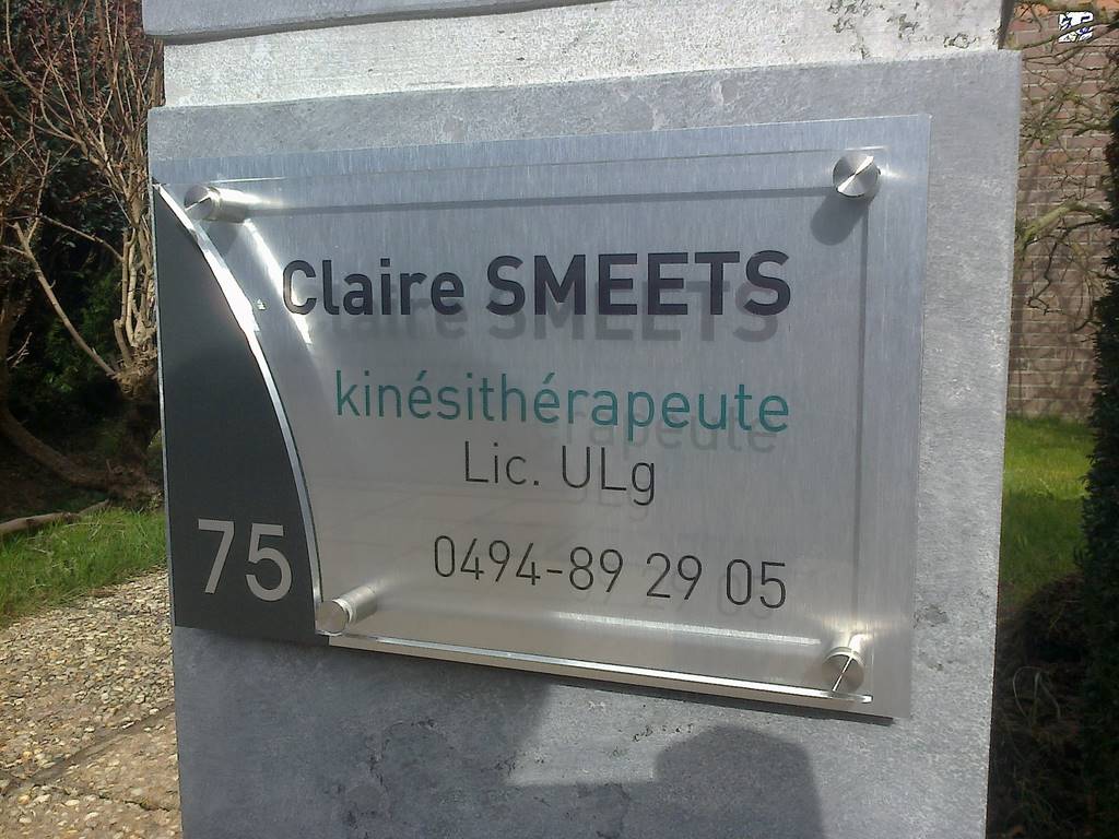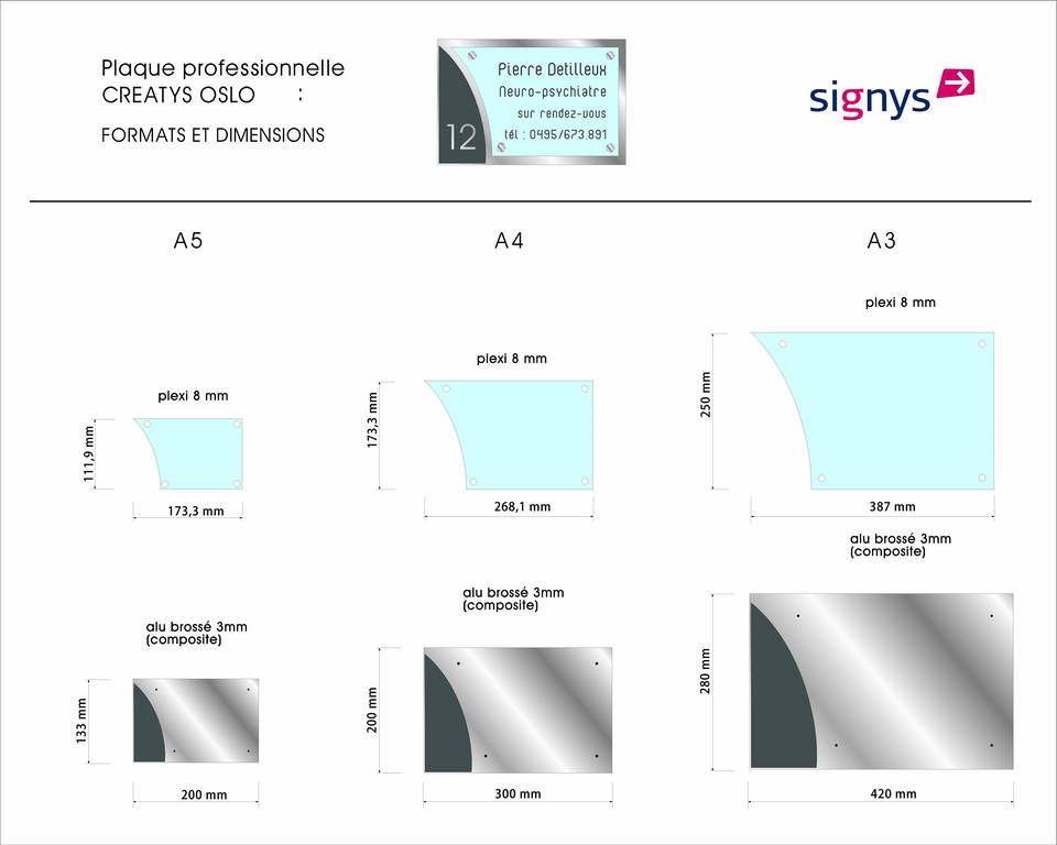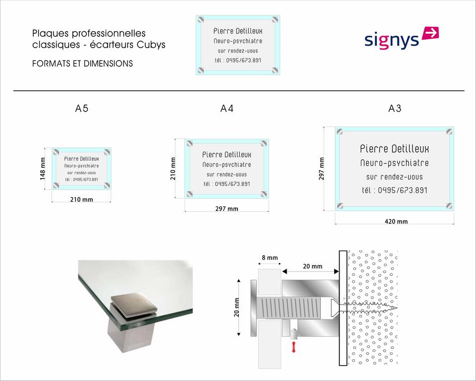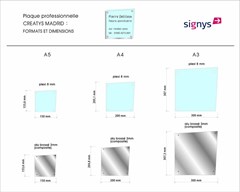 -plaque en alu brossé 3 mm + film sablé de contraste; montage sur 4 écarteurs carrés 20mm en inox brossé + vis et chevilles