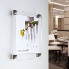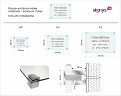 plaque professionnelle en plexi transparent 10mm avec impression arrière et film sablé de contraste; montage sur 4 écarteurs carrés de 20mm en inox brossé + vis et chevilles