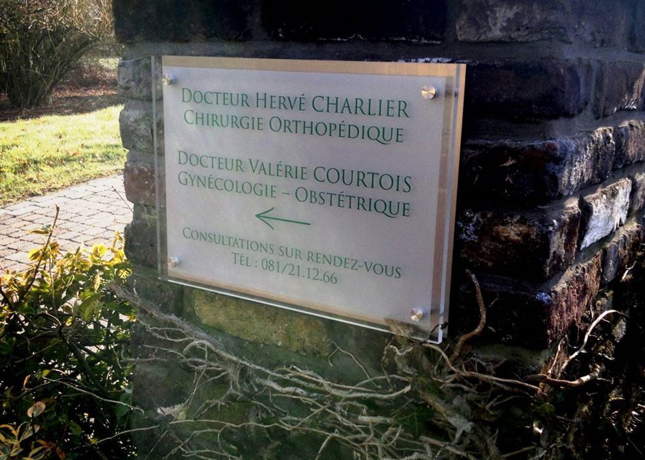 plaque professionnelle en plexi transparent 10mm avec impression arrière et montage sur 4 écarteurs diam.13mm en inox brossé + vis et chevilles ; CONSEIL : produit à utiliser sur un mur assez clair pour une bonne lecture, sinon, demander des textes de couleur très claire