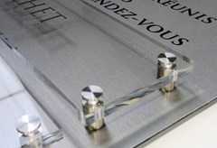 plaque pro plexi 10mm + 4 écarteurs inox 13mm + sablé + sous-plaque + vis et chevilles