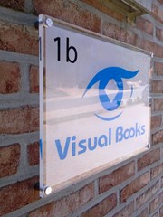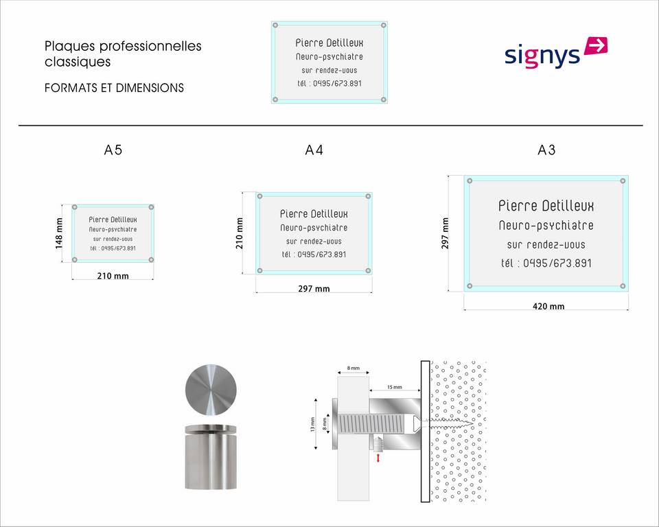 plaque professionnelle en plexi transparent 10mm avec impression arrière et montage sur 4 écarteurs diam.13mm en inox brossé + vis et chevilles ; CONSEIL : produit à utiliser sur un mur assez clair pour une bonne lecture, sinon, demander des textes de couleur très claire
